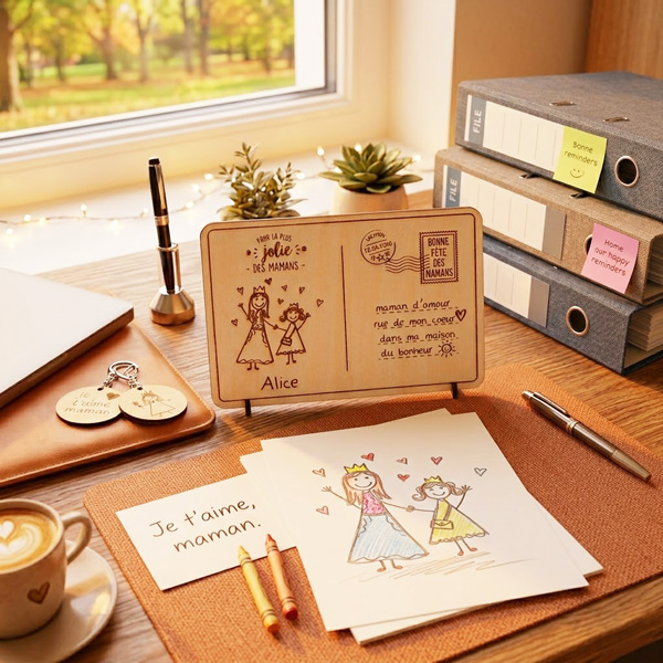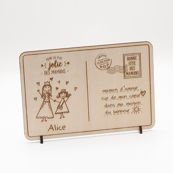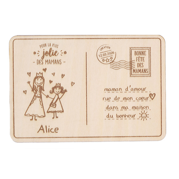 Cette carte postale en bois personnalisée reproduit fidèlement le dessin de votre enfant grâce à une gravure fine et précise. Chaque pièce est unique et raconte une histoire pleine d’amour. Idéale pour célébrer la Fête des Mères avec une attention authentique et pleine de sens. Cette carte est livrée avec un support bois.