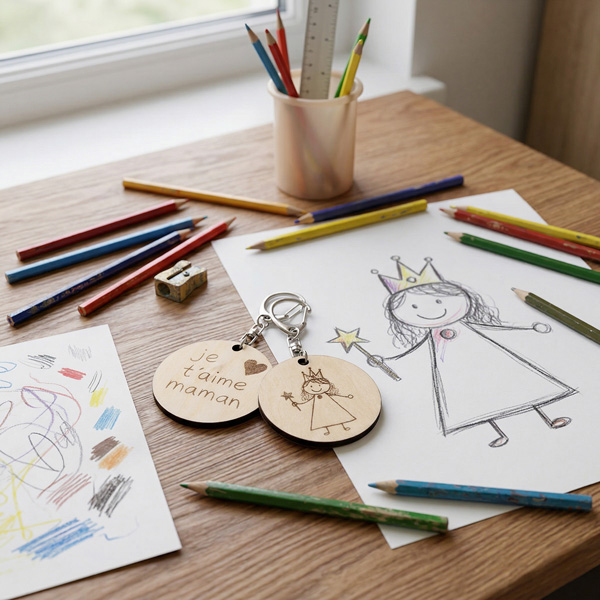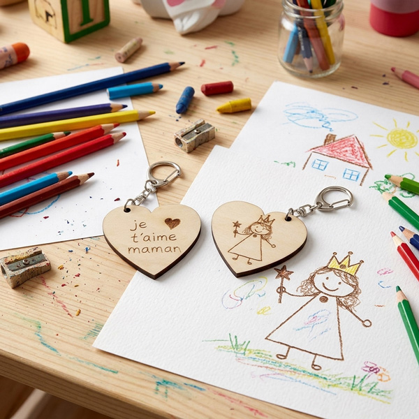 À partir du dessin de votre enfant, nous réalisons une gravure fine et fidèle sur bois naturel, pour créer un bijou unique, authentique et intemporel.